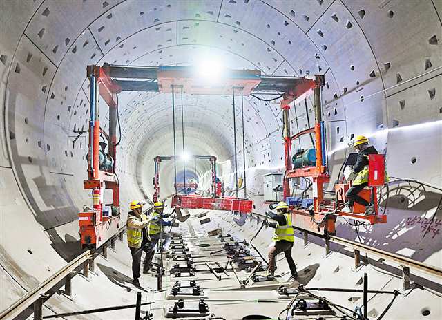 1月20日,重庆轨道交通15号线二期大学城中路站—大学城南路站区间,工人正在进行轨道板铺装。